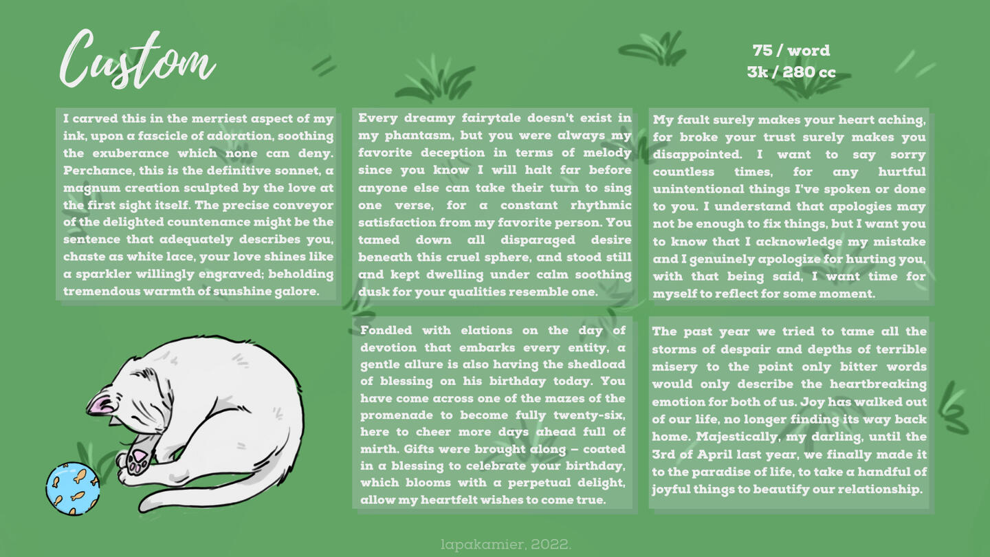 7. HARAP BERSABAR. Pengerjaan dalam hitungan menit sampai 1 hari, atau maksimal tergantung kesibukan penulis. Jika belum menerima preview dari pesananmu selama 1 hari, silahkan chat kembali.