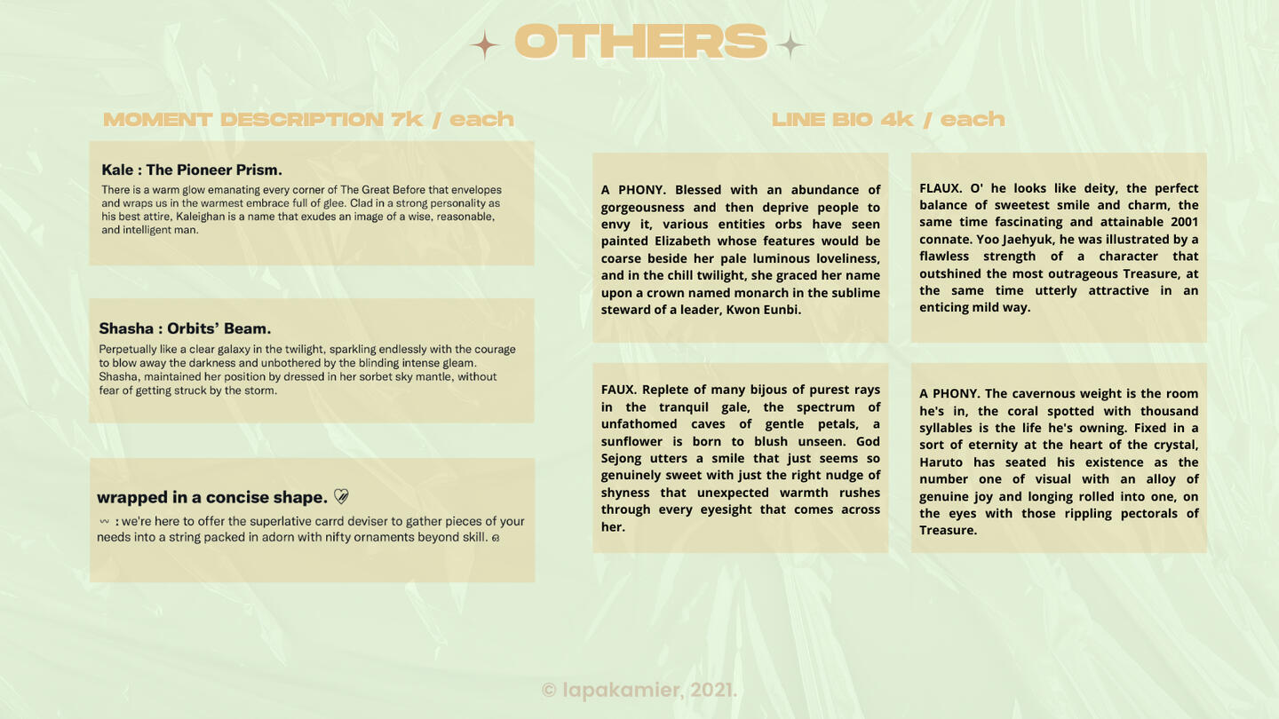 keywords itu berisi kata sifat yang mendeskripsikan character kamu, seperti pretty, angel, charismatic.